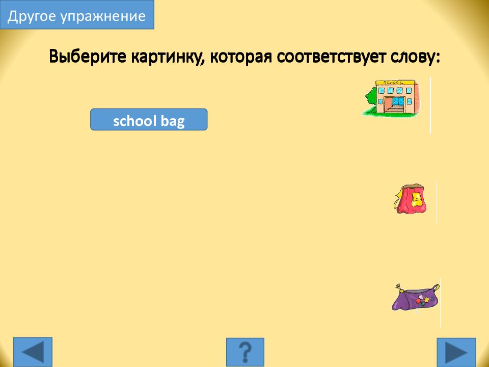 school bag Выберите картинку, которая соответствует слову: Другое упражнение