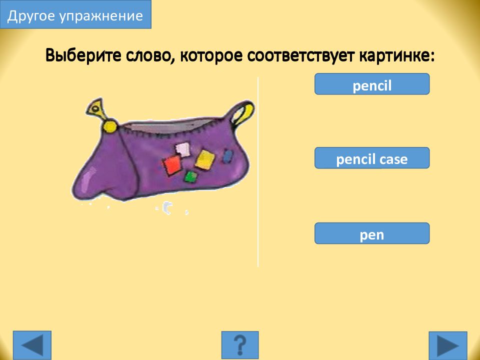 percil case pencil school bag Выберите слово, которое соответствует картинке: Другое упражнение