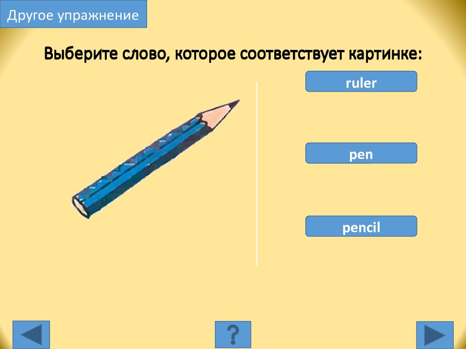 ruler pen pencil Выберите слово, которое соответствует картинке: Другое упражнение