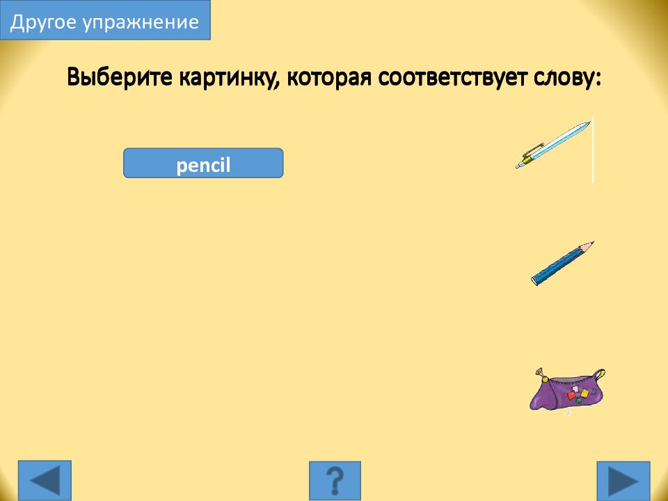 pencil pencil case pen Выберите слово, которое соответствует картинке: Другое упражнение
