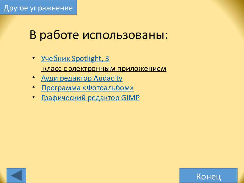 В работе использованы: Учебник Spotlight, 3 класс с электронным приложением Ауди редактор Audacity Программа «Фотоальбом» Графический редактор GIMP Конец Другое упражнение