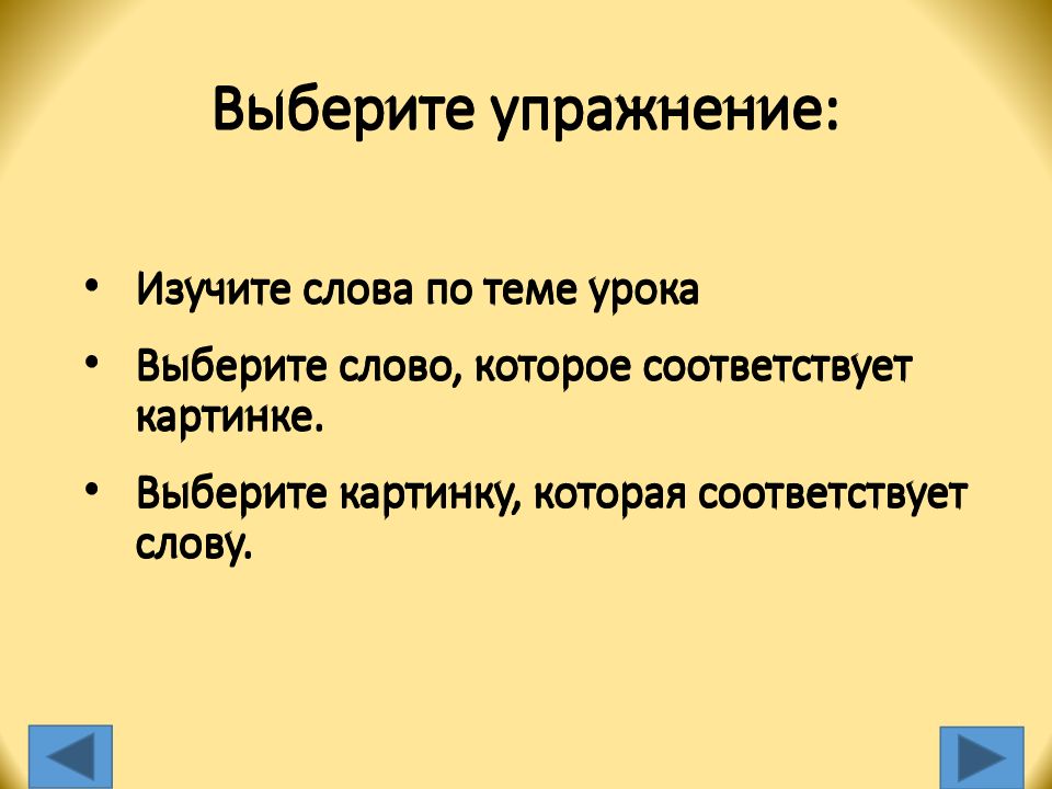 Изучите слова по теме урока Выберите слово, которое соответствует картинке. Выберите картинку, которая соответствует слову.