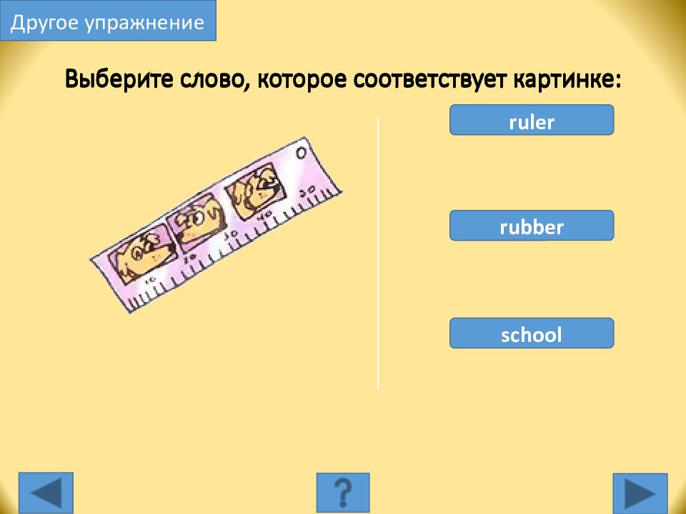ruler rubber school Выберите слово, которое соответствует картинке: Другое упражнение