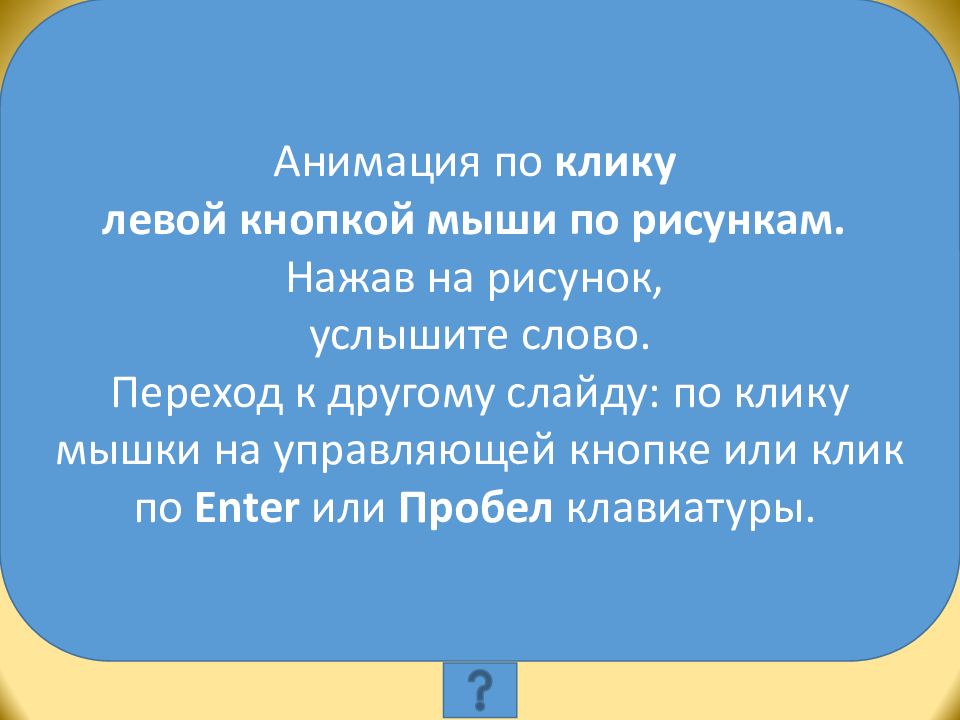 Анимация по клику левой кнопкой мыши по рисункам. Нажав на рисунок, услышите слово. Переход к другому слайду: по клику мышки на управляющей кнопке или клик по Enter или Пробел клавиатуры.