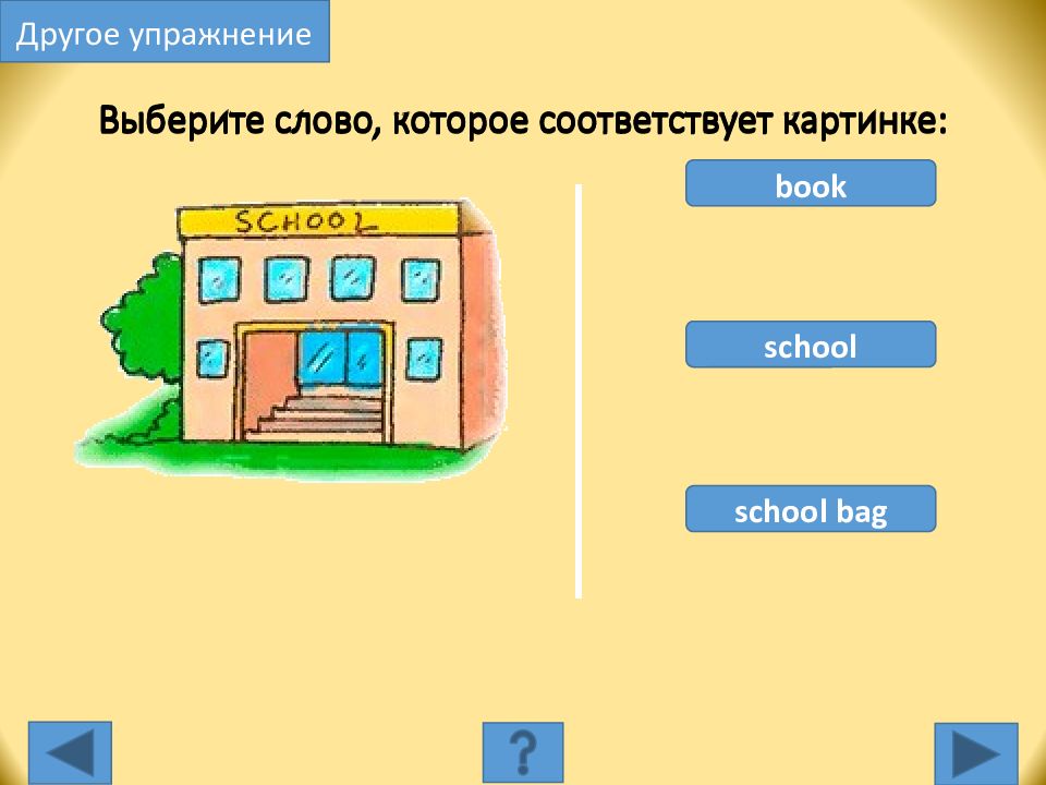 book school school bag Выберите слово, которое соответствует картинке: Другое упражнение