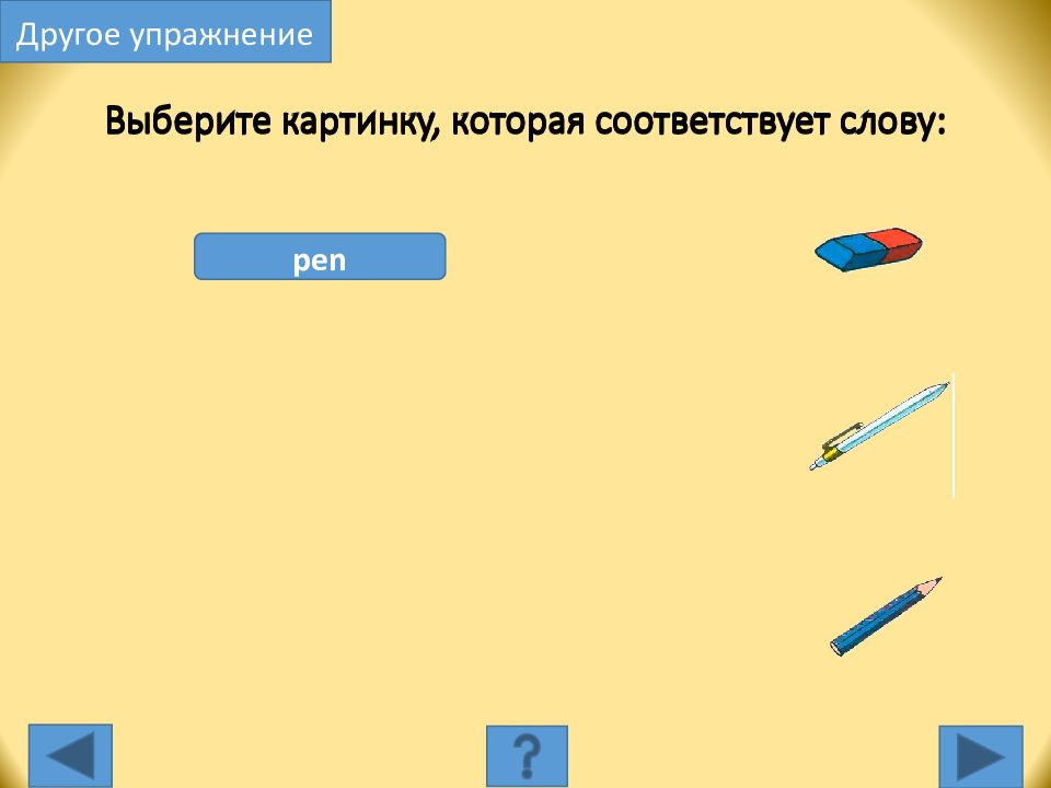 pen Выберите картинку, которая соответствует слову: Другое упражнение