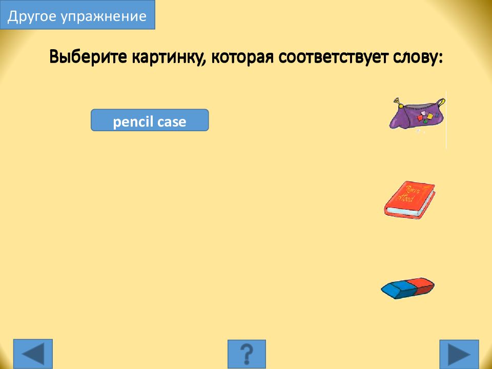 pencil case Выберите картинку, которая соответствует слову: Другое упражнение