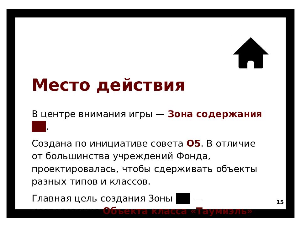 15 В центре внимания игры — Зона содержания ██. Создана по инициативе совета О5. В отличие от большинства учреждений Фонда, проектировалась, чтобы сдерживать объекты разных типов и классов. Главная цель создания Зоны ██ — исследование Объекта класса «Таумиэль».