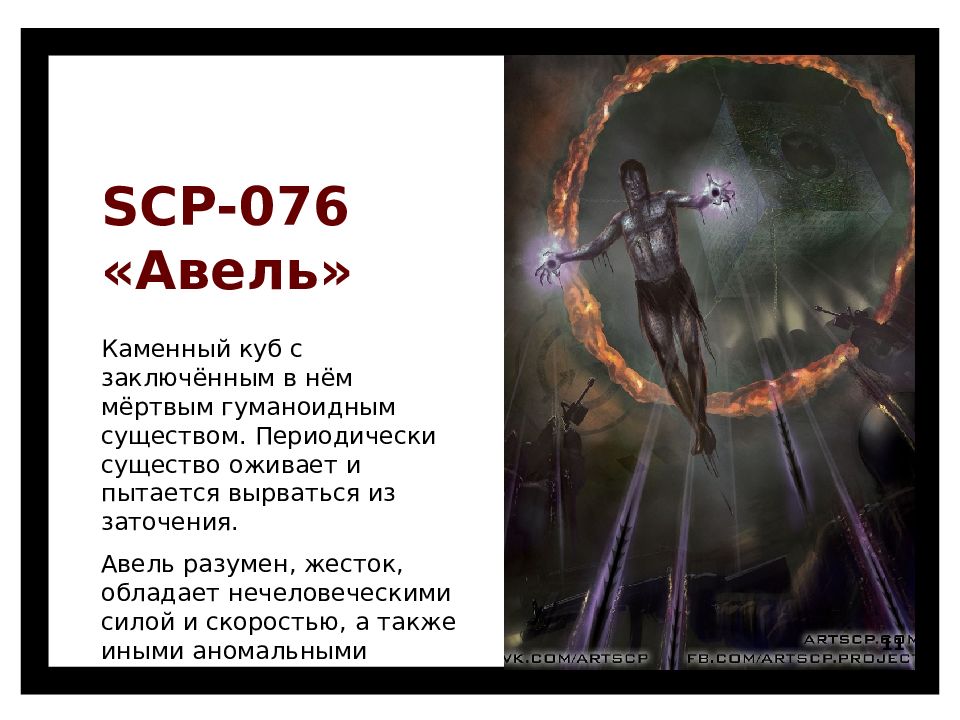 Каменный куб с заключённым в нём мёртвым гуманоидным существом. Периодически существо оживает и пытается вырваться из заточения. Авель разумен, жесток, обладает нечеловеческими силой и скоростью, а также иными аномальны ми способност ями. 11