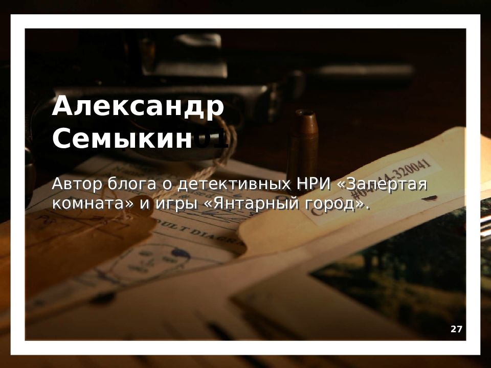 Студия 101 27 Александр Семыкин Автор блога о детективных НРИ «Запертая комната» и игры «Янтарный город». Автор блога о детективных НРИ «Запертая комната» и игры «Янтарный город».