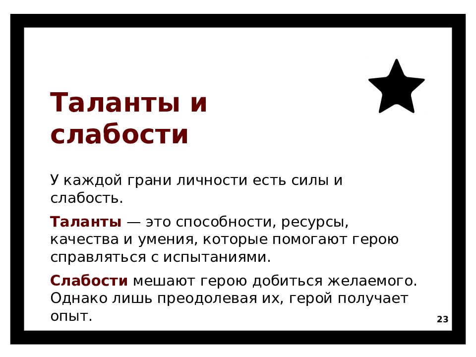 23 У каждой грани личности есть силы и слабость. Таланты — это способности, ресурсы, качества и умения, которые помогают герою справляться с испытаниями. Слабости мешают герою добиться желаемого. Однако лишь преодолевая их, герой получает опыт.