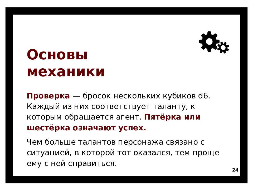 24 Проверка — бросок нескольких кубиков d6. Каждый из них соответствует таланту, к которым обращается агент. Пятёрка или шестёрка означают успех. Чем больше талантов персонажа связано с ситуацией, в которой тот оказался, тем проще ему с ней справиться.