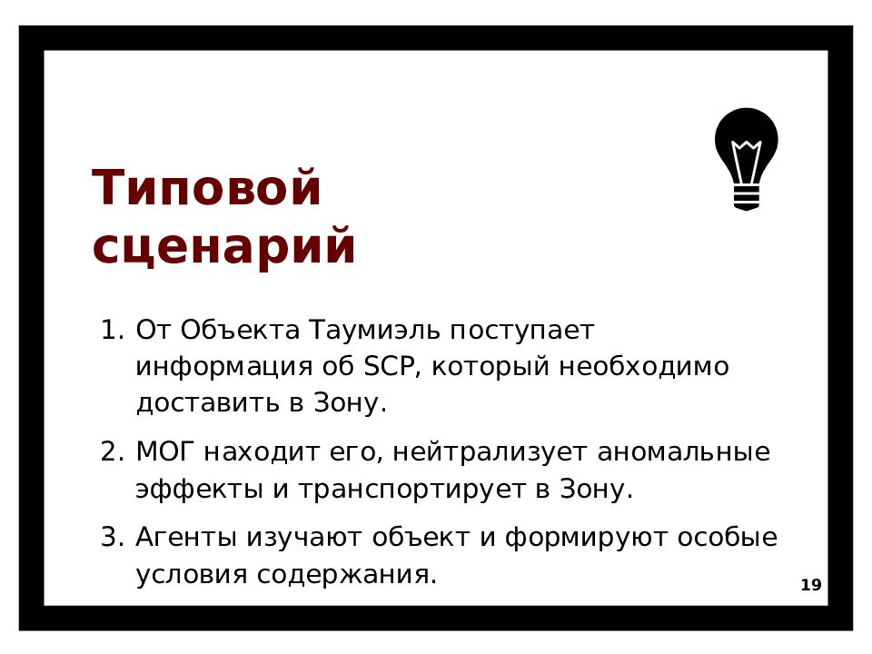 19 От Объекта Таумиэль поступает информация об SCP, который необходимо доставить в Зону. МОГ находит его, нейтрализует аномальные эффекты и транспортирует в Зону. Агенты изучают объект и формируют особые условия содержания.
