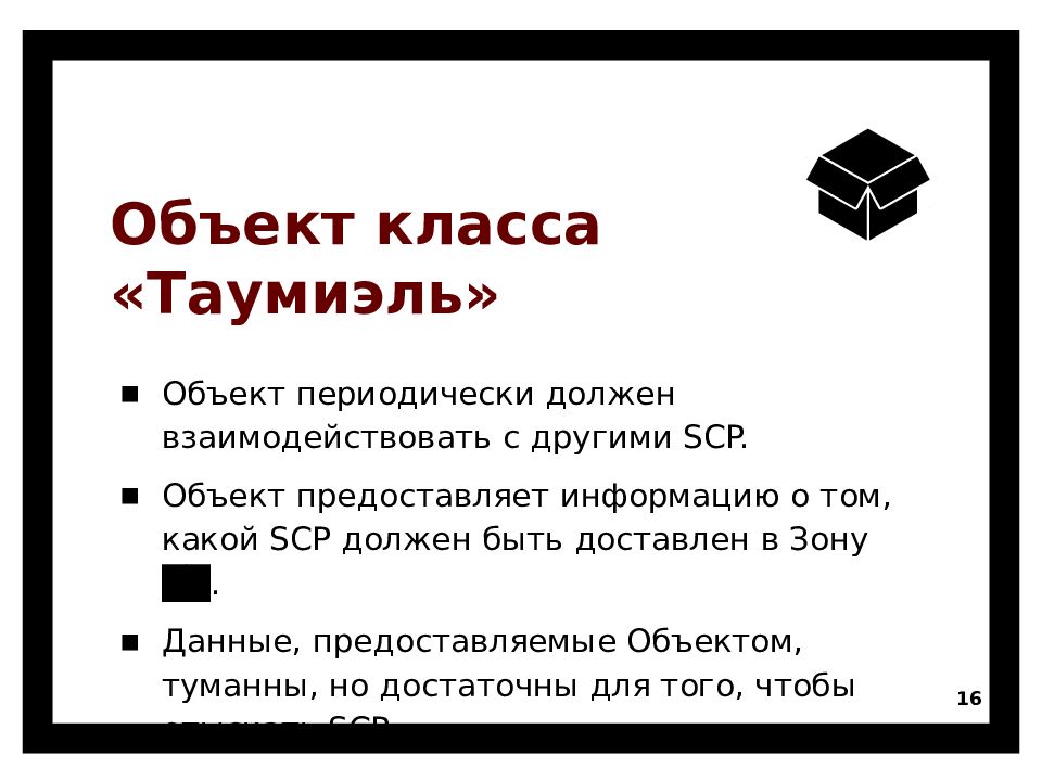16 Объект периодически должен взаимодействовать с другими SCP. Объект предоставляет информацию о том, какой SCP должен быть доставлен в Зону ██. Данные, предоставляемые Объектом, туманны, но достаточны для того, чтобы отыскать SCP.