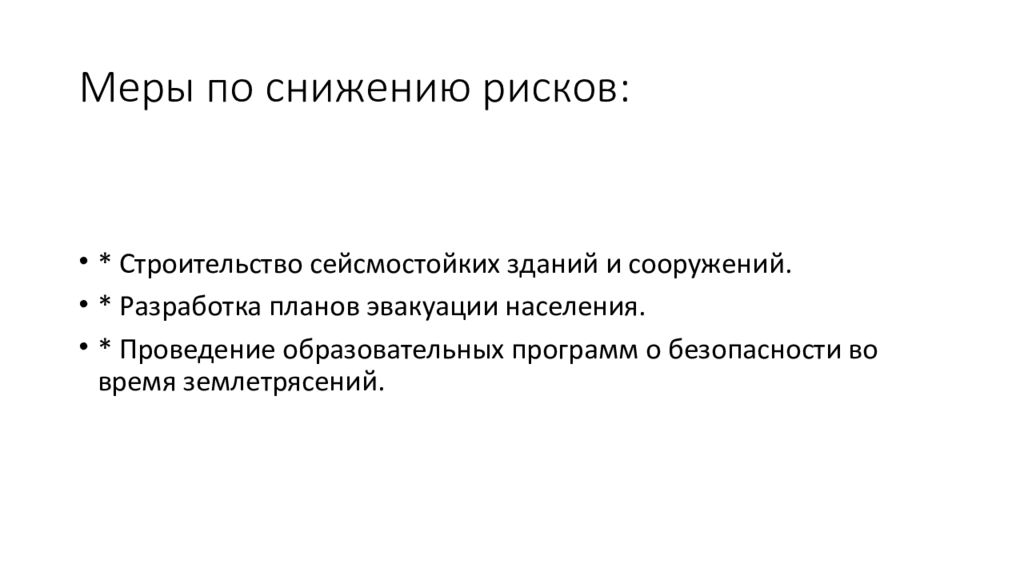 * Строительство сейсмостойких зданий и сооружений. * Разработка планов эвакуации населения. * Проведение образовательных программ о безопасности во время землетрясений.