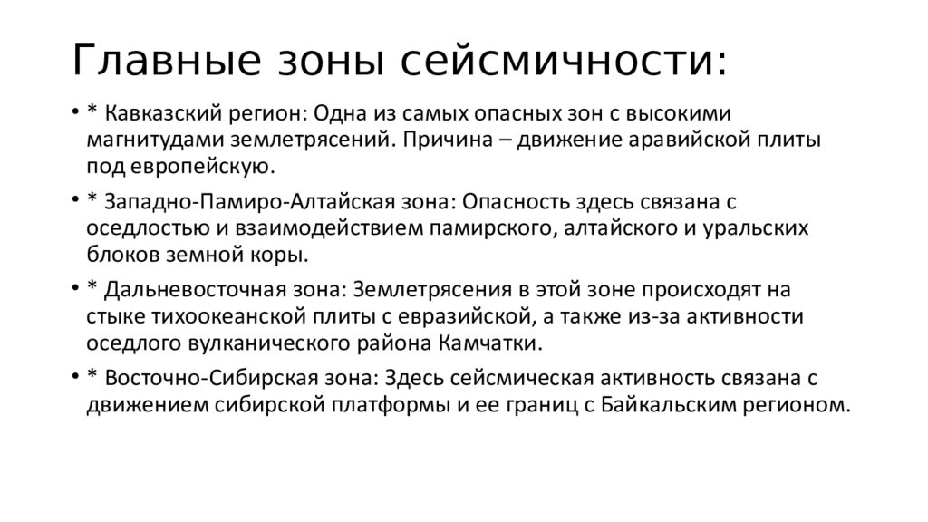 * Кавказский регион: Одна из самых опасных зон с высокими магнитудами землетрясений. Причина – движение аравийской плиты под европейскую. * Западно-Памиро-Алтайская зона: Опасность здесь связана с оседлостью и взаимодействием памирского, алтайского и уральских блоков земной коры. * Дальневосточная зона: Землетрясения в этой зоне происходят на стыке тихоокеанской плиты с евразийской, а также из-за активности оседлого вулканического района Камчатки. * Восточно-Сибирская зона: Здесь сейсмическая активность связана с движением сибирской платформы и ее границ с Байкальским регионом.