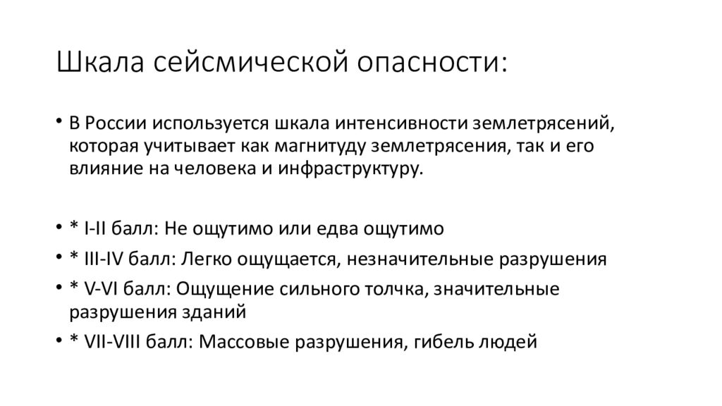 В России используется шкала интенсивности землетрясений, которая учитывает как магнитуду землетрясения, так и его влияние на человека и инфраструктуру. * I-II балл: Не ощутимо или едва ощутимо * III-IV балл: Легко ощущается, незначительные разрушения * V-VI балл: Ощущение сильного толчка, значительные разрушения зданий * VII-VIII балл: Массовые разрушения, гибель людей