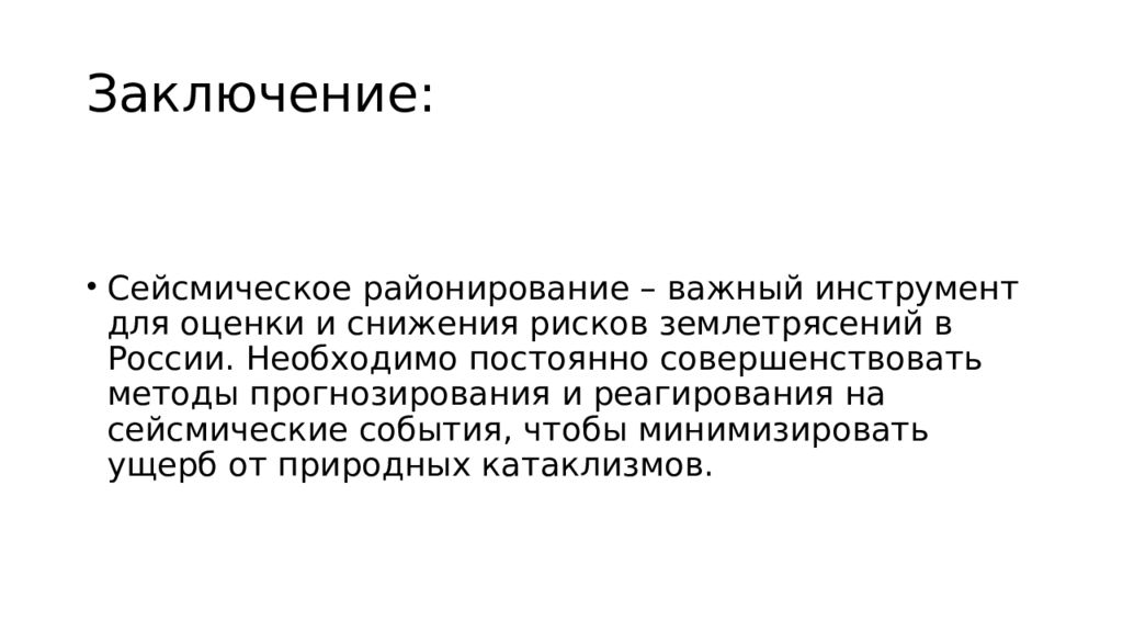 Последний слайд презентации: Сейсмическое районирование территории России: Заключение: