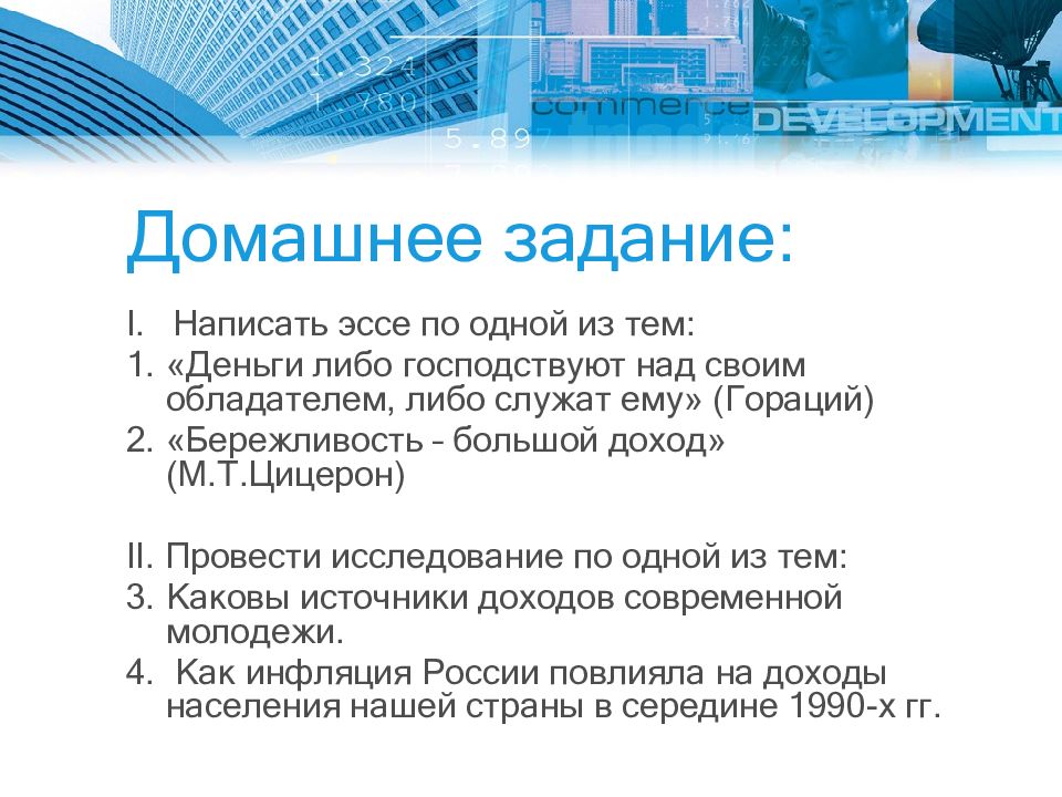 Написать эссе по одной из тем: «Деньги либо господствуют над своим обладателем, либо служат ему» (Гораций) «Бережливость – большой доход» ( М.Т.Цицерон ) II. Провести исследование по одной из тем: Каковы источники доходов современной молодежи. Как инфляция России повлияла на доходы населения нашей страны в середине 1990-х гг.
