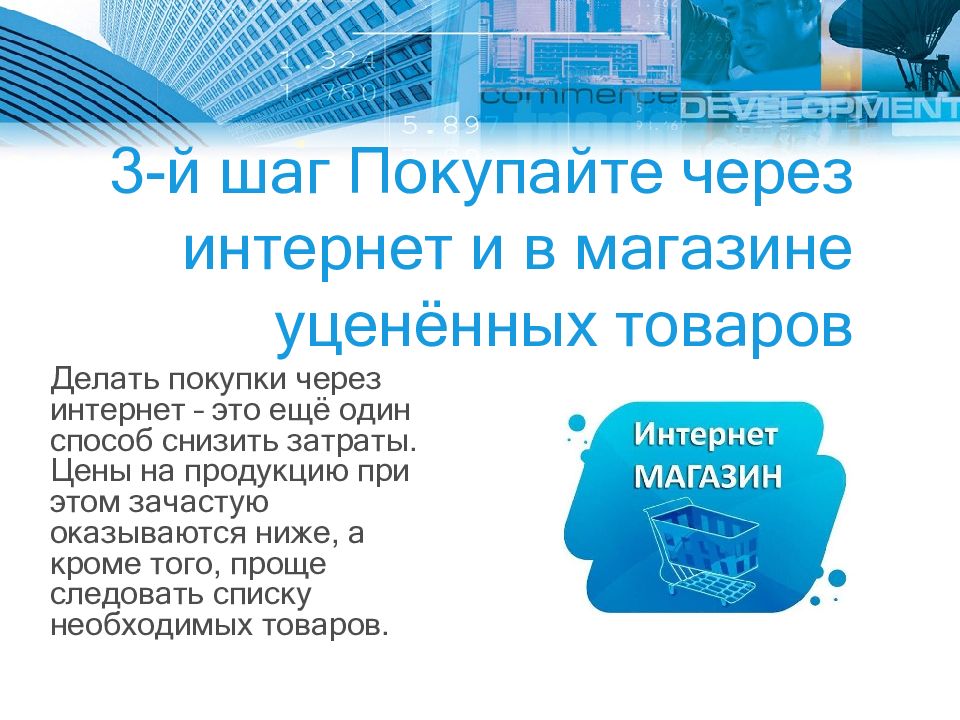 Слайд 7: 3-й шаг Покупайте через интернет и в магазине уценённых товаров