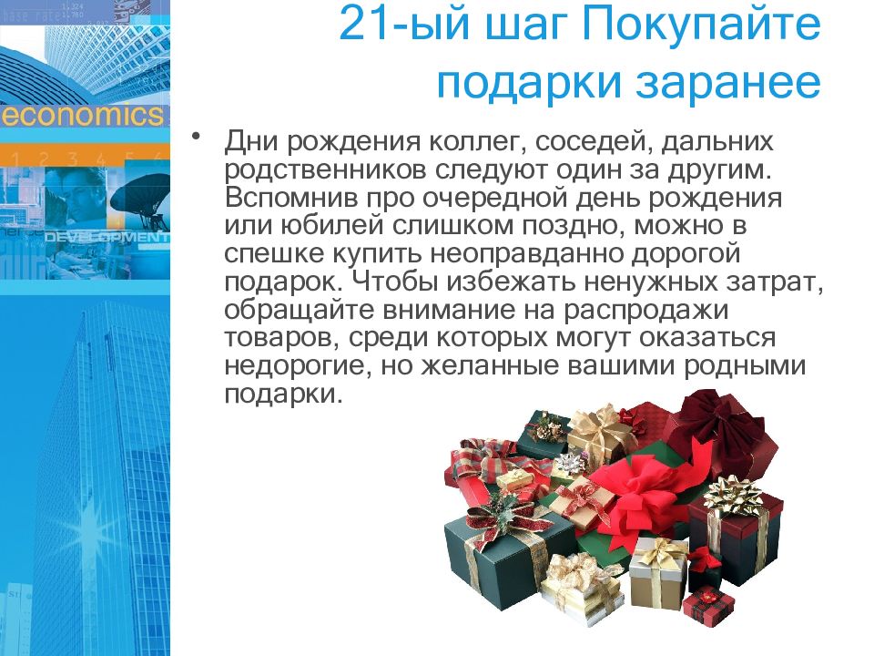 Слайд 22: 21-ый шаг Покупайте подарки заранее