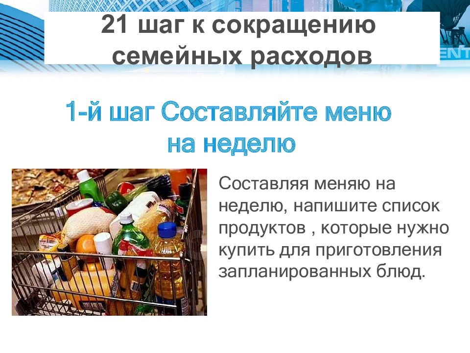 Составляя меняю на неделю, напишите список продуктов, которые нужно купить для приготовления запланированных блюд. 21 шаг к сокращению семейных расходов