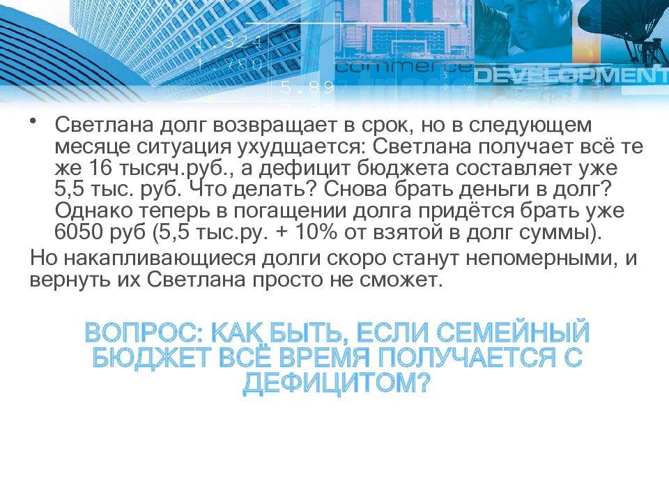 Светлана долг возвращает в срок, но в следующем месяце ситуация ухудщается : Светлана получает всё те же 16 тысяч.руб., а дефицит бюджета составляет уже 5,5 тыс. руб. Что делать? Снова брать деньги в долг? Однако теперь в погащении долга придётся брать уже 6050 руб (5,5 тыс.ру. + 10% от взятой в долг суммы). Но накапливающиеся долги скоро станут непомерными, и вернуть их Светлана просто не сможет. ВОПРОС: КАК БЫТЬ, ЕСЛИ СЕМЕЙНЫЙ БЮДЖЕТ ВСЁ ВРЕМЯ ПОЛУЧАЕТСЯ С ДЕФИЦИТОМ?