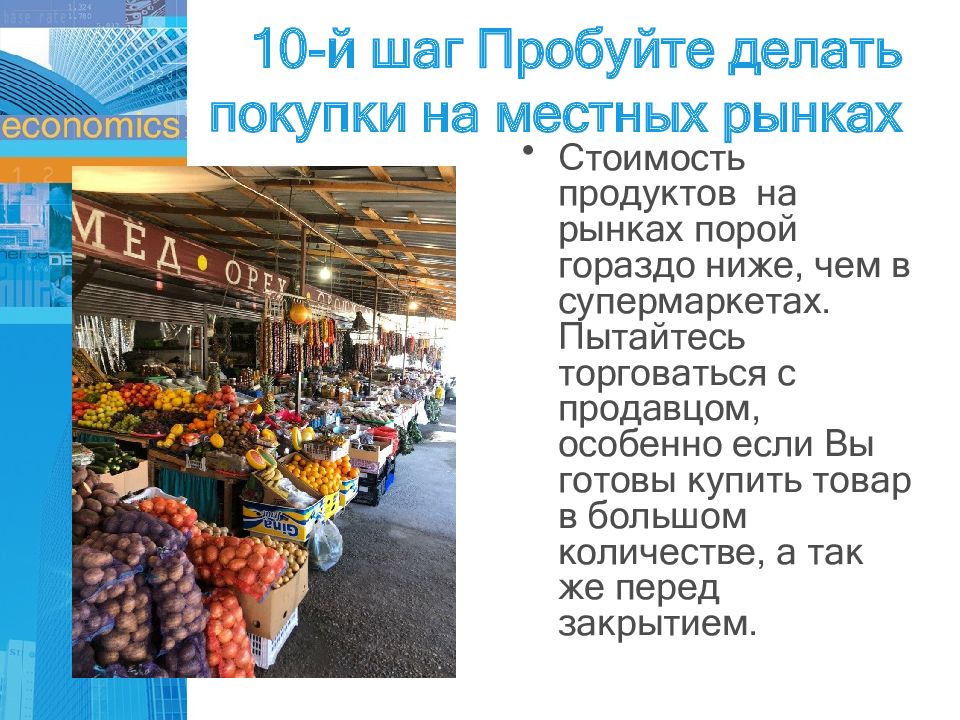 Слайд 12: 10-й шаг Пробуйте делать покупки на местных рынках