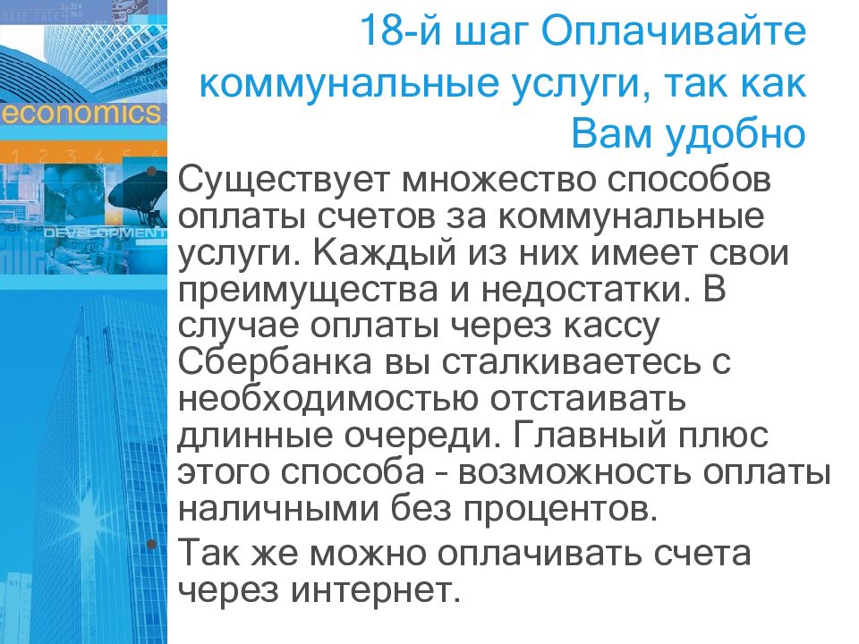 Слайд 19: 18-й шаг Оплачивайте коммунальные услуги, так как Вам удобно