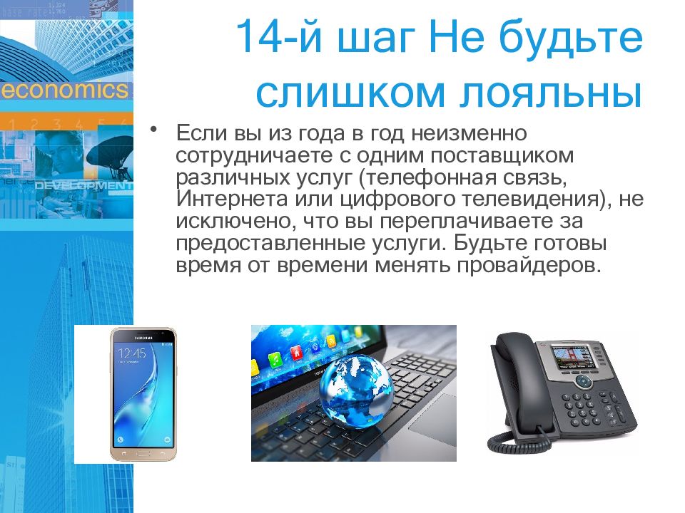 Если вы из года в год неизменно сотрудничаете с одним поставщиком различных услуг (телефонная связь, Интернета или цифрового телевидения), не исключено, что вы переплачиваете за предоставленные услуги. Будьте готовы время от времени менять провайдеров. 14-й шаг Не будьте слишком лояльны