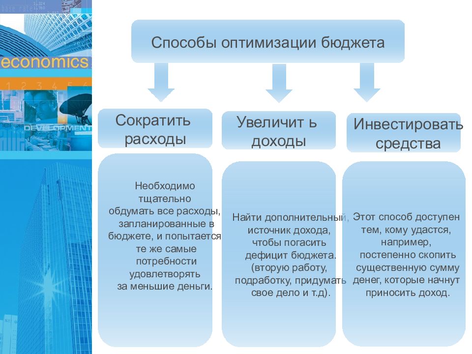 Сократить расходы Увеличит ь доходы Инвестировать средства Способы оптимизации бюджета Необходимо тщательно обдумать все расходы, запланированные в бюджете, и попытается те же самые потребности удовлетворять за меньшие деньги. Найти дополнительный, источник дохода, чтобы погасить дефицит бюджета. (вторую работу, подработку, придумать свое дело и т.д ). Этот способ доступен тем, кому удастся, например, постепенно скопить существенную сумму денег, которые начнут приносить доход.