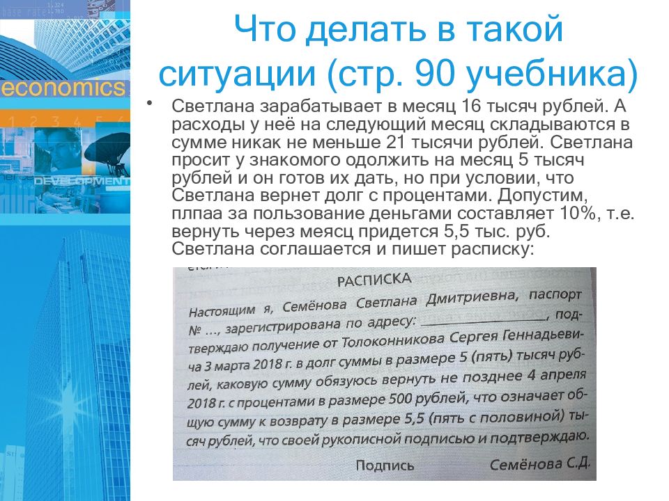 Светлана зарабатывает в месяц 16 тысяч рублей. А расходы у неё на следующий месяц складываются в сумме никак не меньше 21 тысячи рублей. Светлана просит у знакомого одолжить на месяц 5 тысяч рублей и он готов их дать, но при условии, что Светлана вернет долг с процентами. Допустим, плпаа за пользование деньгами составляет 10%, т.е. вернуть через меясц придется 5,5 тыс. руб. Светлана соглашается и пишет расписку:
