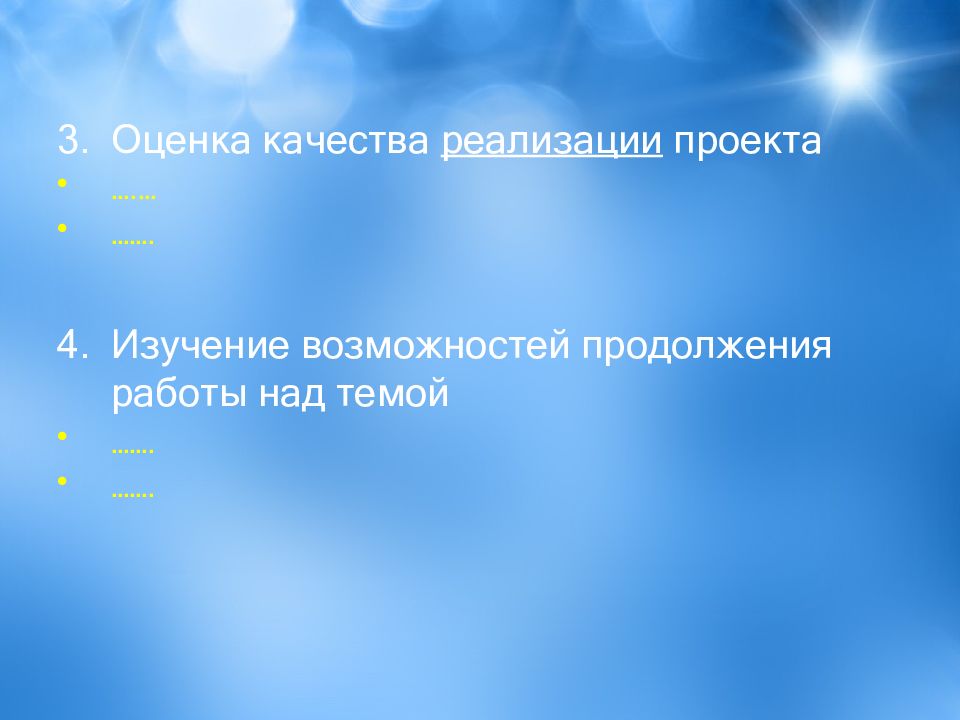 3. Оценка качества реализации проекта ….… ……. 4. Изучение возможностей продолжения работы над темой ……. …….