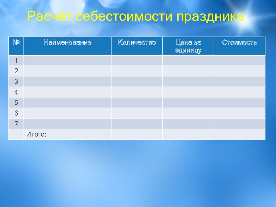 № Наименование Количество Цена за единицу Стоимость 1 2 3 4 5 6 7 Итого: