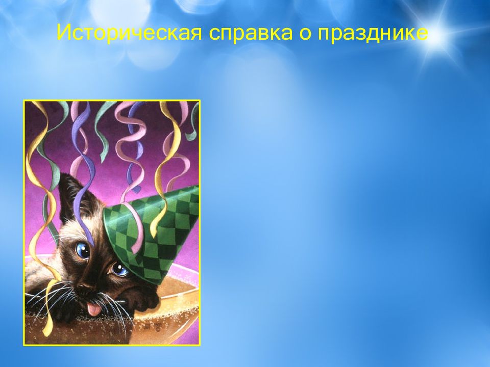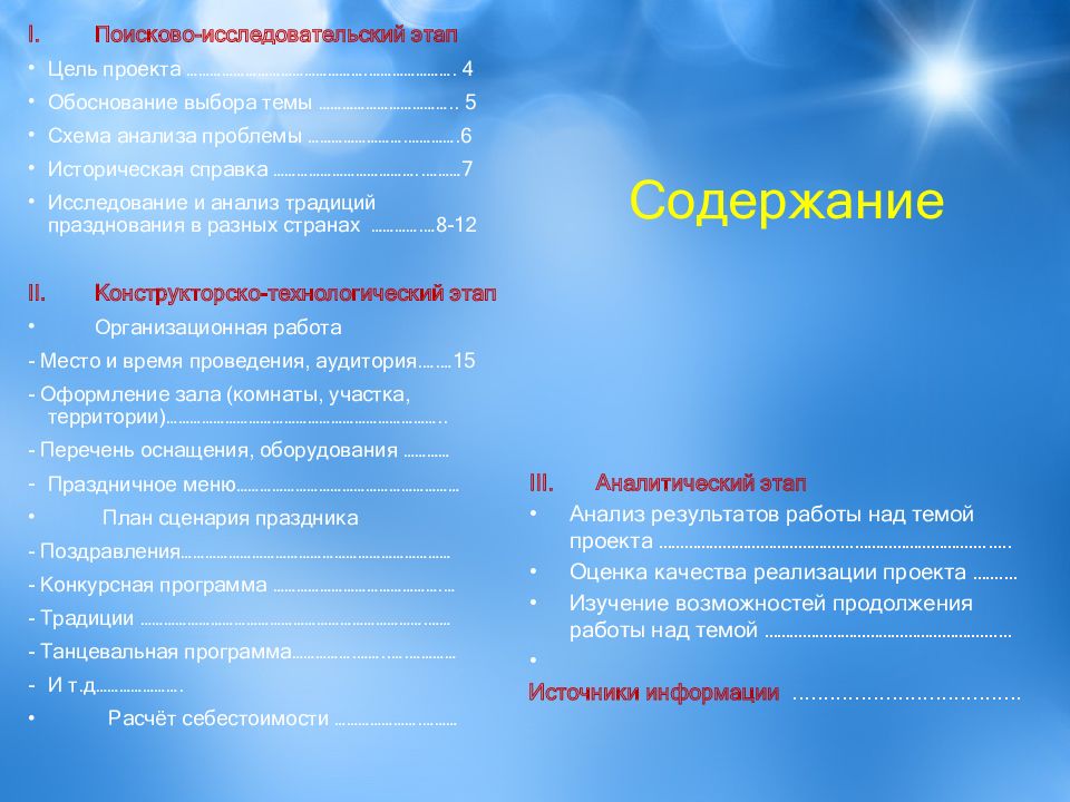 Аналитический этап Анализ результатов работы над темой проекта ……………………………………….…………………………..…. Оценка качества реализации проекта …….… Изучение возможностей продолжения работы над темой ……………………………………………….… Источники информации..................................... Поисково-исследовательский этап Цель проекта ……………………………………….…………………. 4 Обоснование выбора темы …………………………….. 5 Схема анализа проблемы …………………….………….6 Историческая справка ………………………………..………7 Исследование и анализ традиций празднования в разных странах ………….…8-12 Конструкторско-технологический этап Организационная работа - Место и время проведения, аудитория.….…15 - Оформление зала (комнаты, участка, территории)…………………………………………………………….. - Перечень оснащения, оборудования ………… Праздничное меню………………………………………………… План сценария праздника - Поздравления…………………………………………………………… - Конкурсная программа …………………………………….… - Традиции ……………………………………………………………….…… - Танцевальная программа…………….……..….………… И т.д…………………. Расчёт себестоимости ………………….………