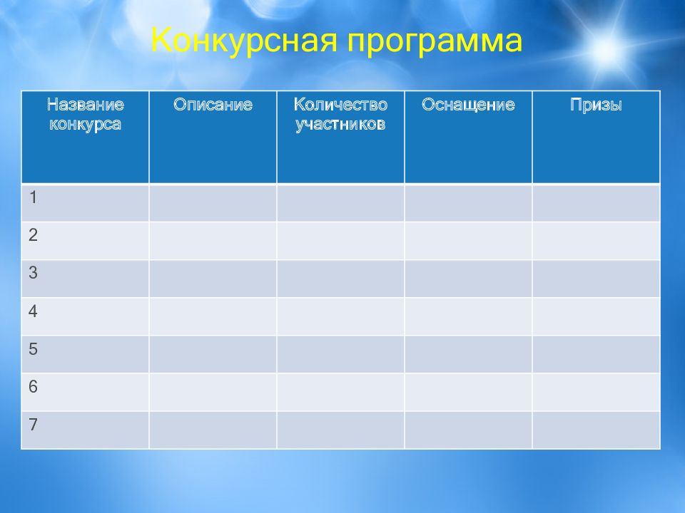 Название конкурса Описание Количество участников Оснащение Призы 1 2 3 4 5 6 7