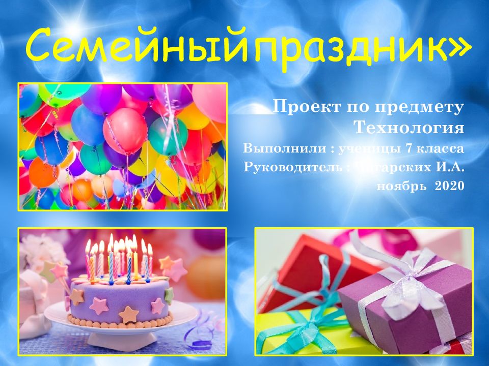 Проект по предмету Технология Выполнили : ученицы 7 класса Руководитель : Чигарских И.А. ноябрь 2020 Семейныйпраздник »