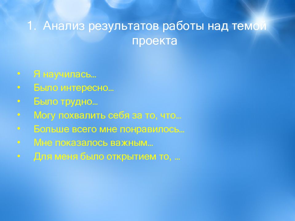 Анализ результатов работы над темой проекта Я научилась… Было интересно… Было трудно… Могу похвалить себя за то, что… Больше всего мне понравилось… Мне показалось важным… Для меня было открытием то, …