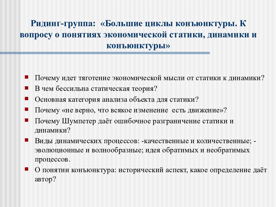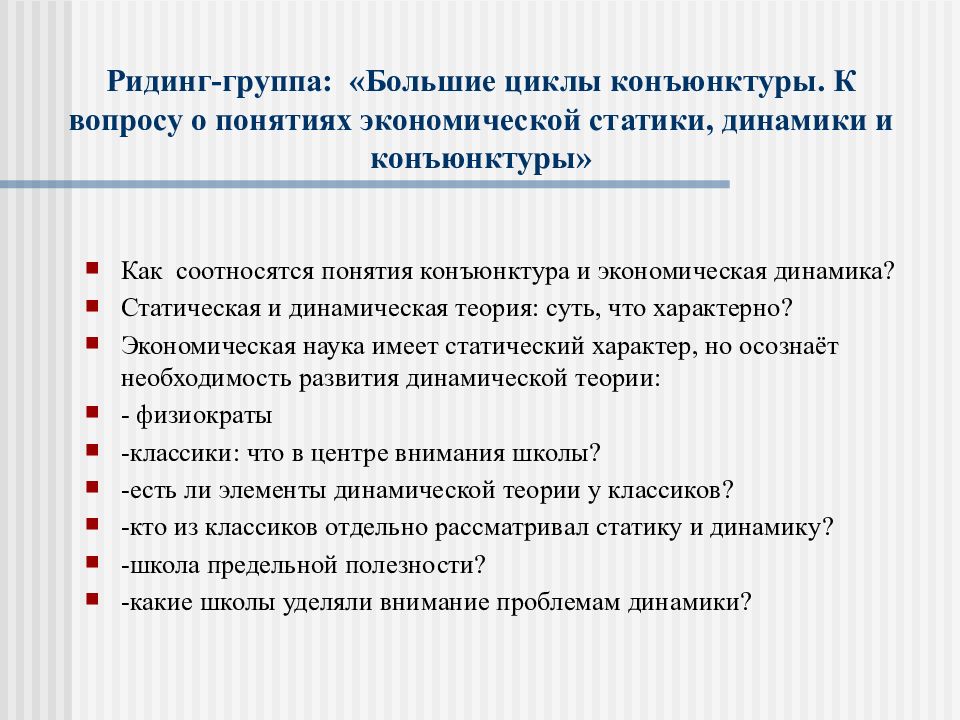Слайд 7: Ридинг-группа: «Большие циклы конъюнктуры. К вопросу о понятиях экономической статики, динамики и конъюнктуры»