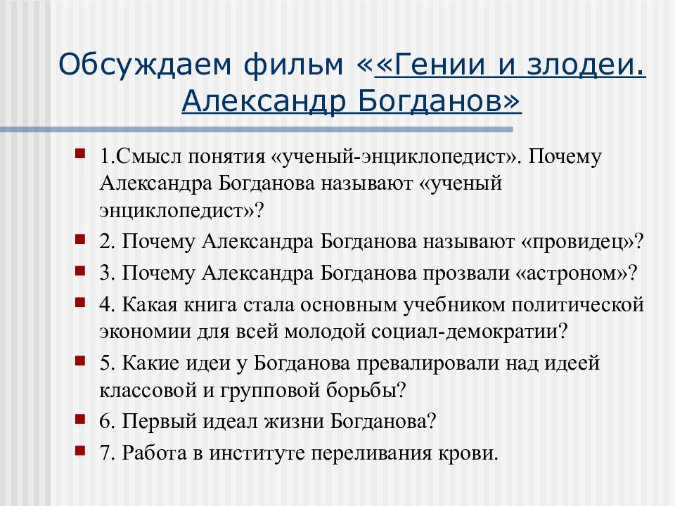Слайд 9: Обсуждаем фильм « «Гении и злодеи. Александр Богданов»