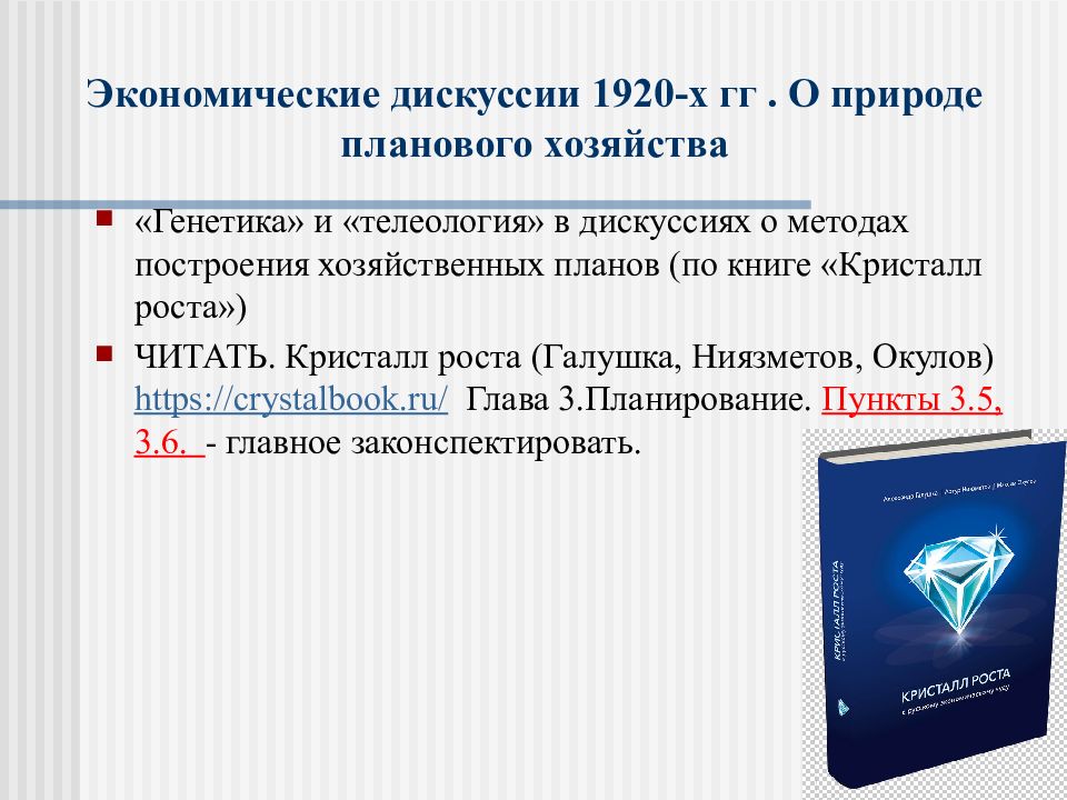 «Генетика» и «телеология» в дискуссиях о методах построения хозяйственных планов (по книге «Кристалл роста») ЧИТАТЬ. Кристалл роста (Галушка, Ниязметов, Окулов) https://crystalbook.ru/ Глава 3.Планирование. Пункты 3.5, 3.6. - главное законспектировать.