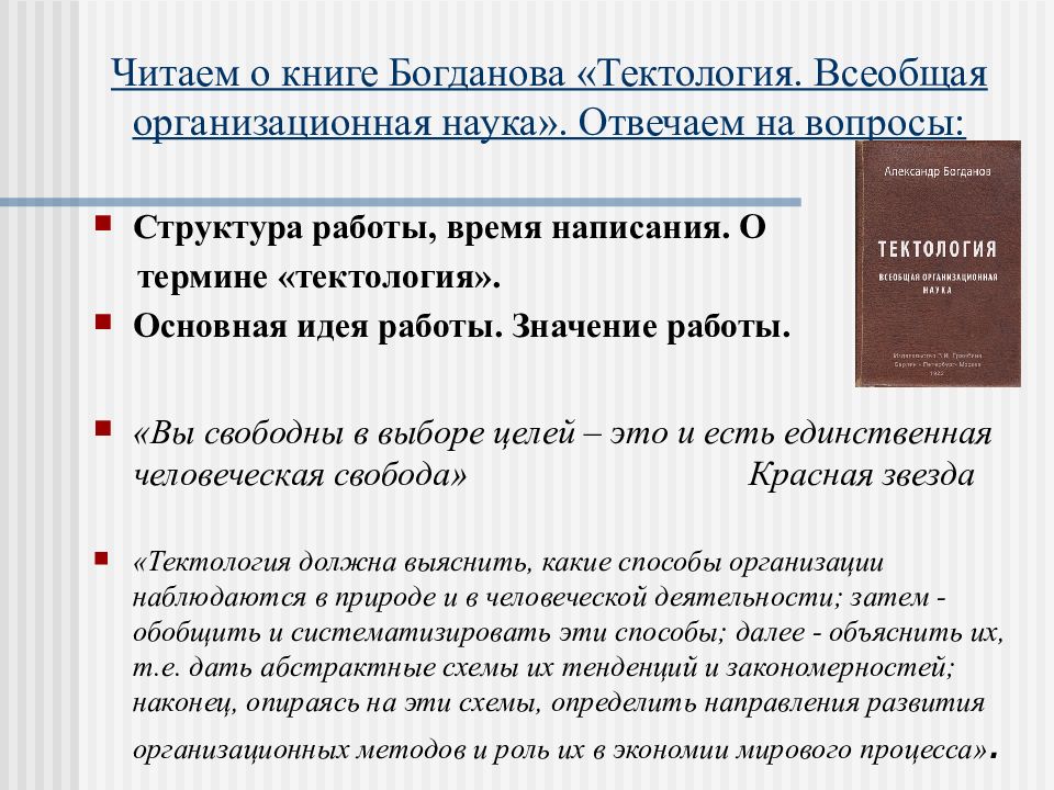 Структура работы, время написания. О термине «тектология». Основная идея работы. Значение работы. «Вы свободны в выборе целей – это и есть единственная человеческая свобода» Красная звезда «Тектология должна выяснить, какие способы организации наблюдаются в природе и в человеческой деятельности; затем - обобщить и систематизировать эти способы; далее - объяснить их, т.е. дать абстрактные схемы их тенденций и закономерностей; наконец, опираясь на эти схемы, определить направления развития организационных методов и роль их в экономии мирового процесса».