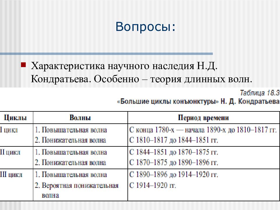 Характеристика научного наследия Н.Д. Кондратьева. Особенно – теория длинных волн.