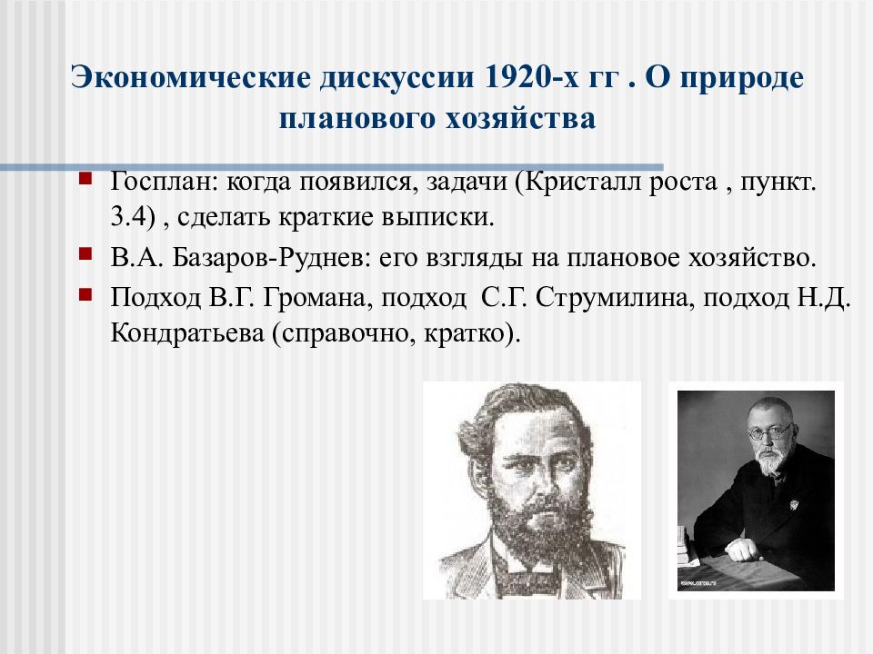 Госплан: когда появился, задачи (Кристалл роста, пункт. 3.4), сделать краткие выписки. В.А. Базаров-Руднев: его взгляды на плановое хозяйство. Подход В.Г. Громана, подход С.Г. Струмилина, подход Н.Д. Кондратьева (справочно, кратко).