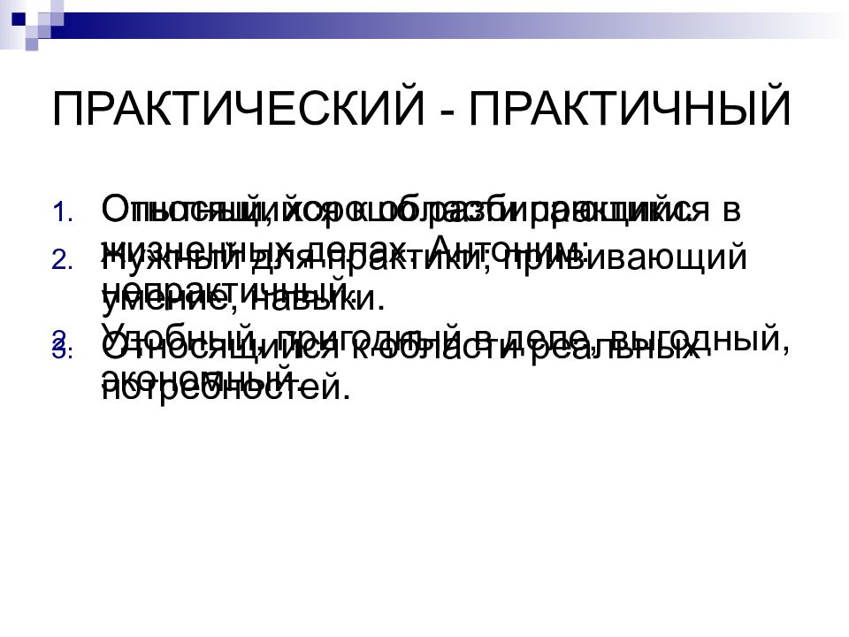 Относящийся к области практики. Нужный для практики; прививающий умение, навыки. Относящийся к области реальных потребностей. Опытный, хорошо разбирающийся в жизненных делах. Антоним: непрактичный. Удобный, пригодный в деле, выгодный, экономный.