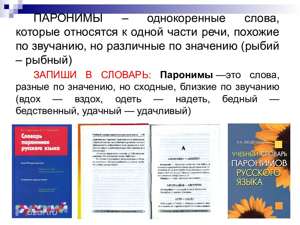 ПАРОНИМЫ – однокоренные слова, которые относятся к одной части речи, похожие по звучанию, но различные по значению (рыбий – рыбный) ЗАПИШИ В СЛОВАРЬ: Паронимы —это слова, разные по значению, но сходные, близкие по звучанию (вдох — вздох, одеть — надеть, бедный — бедственный, удачный — удачливый)