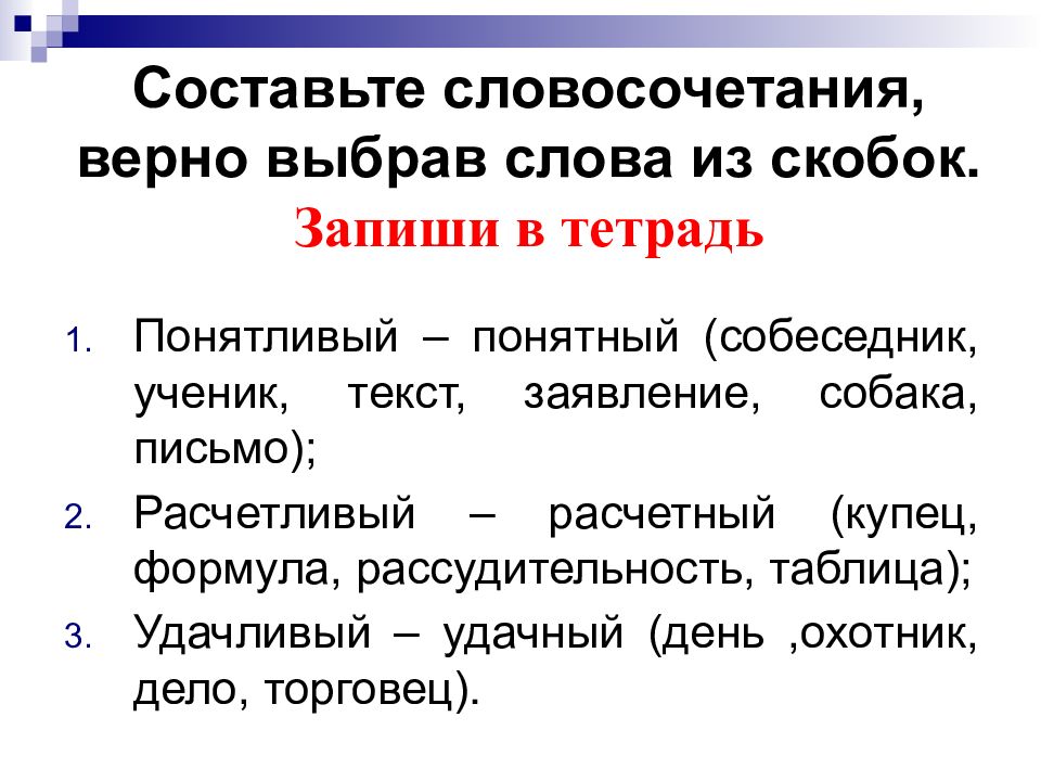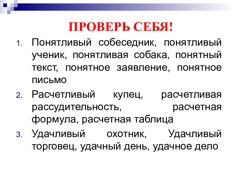 Понятливый – понятный (собеседник, ученик, текст, заявление, собака, письмо); Расчетливый – расчетный (купец, формула, рассудительность, таблица); Удачливый – удачный (день,охотник, дело, торговец).