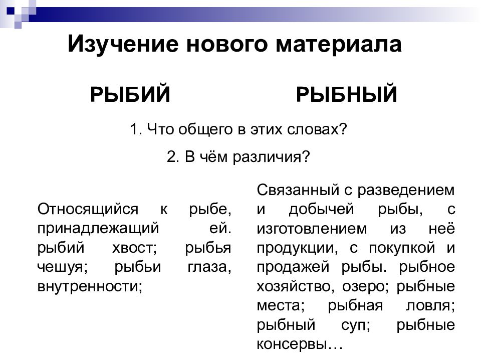РЫБИЙ РЫБНЫЙ Относящийся к рыбе, принадлежащий ей. рыбий хвост; рыбья чешуя; рыбьи глаза, внутренности; Связанный с разведением и добычей рыбы, с изготовлением из неё продукции, с покупкой и продажей рыбы. рыбное хозяйство, озеро; рыбные места; рыбная ловля; рыбный суп; рыбные консервы… Изучение нового материала Что общего в этих словах? В чём различия?
