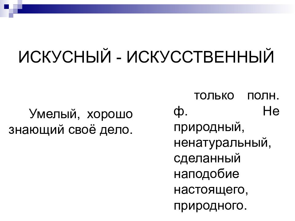 Слайд 16: ИСКУСНЫЙ - ИСКУССТВЕННЫЙ
