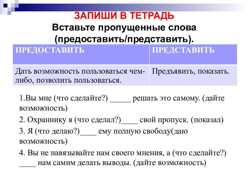 1.Вы мне (что сделайте?) _____ решать это самому. (дайте возможность) 2. Охраннику я (что сделал?)____ свой пропуск. (показал) 3. Я (что делаю?)____ ему полную свободу(даю возможность) 4. Вы не навязывайте нам своего мнения, а (что сделайте?) ____ нам самим делать выводы. (дайте возможность) ПРЕДОСТАВИТЬ ПРЕДСТАВИТЬ Дать возможность пользоваться чем-либо, позволить пользоваться. Предъявить, показать.